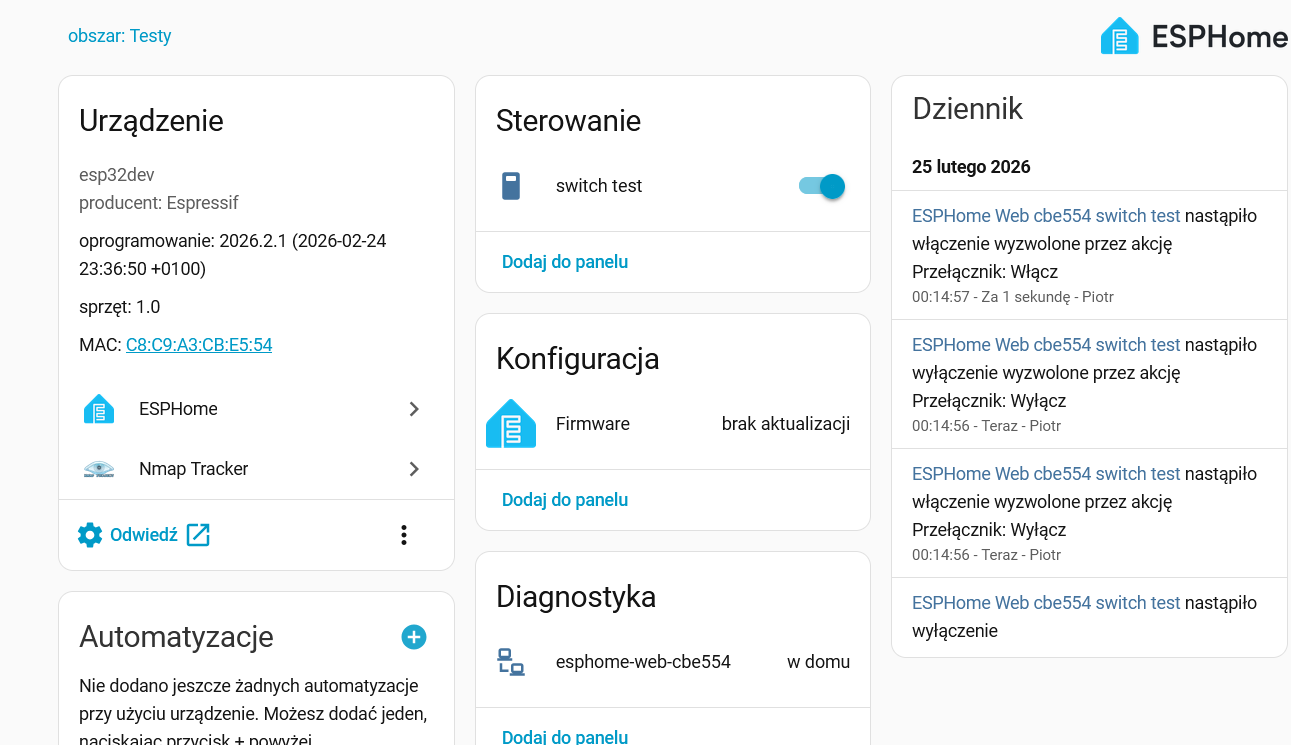 2 tygodnie temu mogła być jakaś starsza wersja wsadu (wątpię, ale być może oparta na frameworku arduino), nie wnikając w szczegóły ESPHome ma aktualizacje dużych wersji co miesiąc oraz hotfixy kilka razy w miesiącu, więc nie polecam takiej roboty na raty, inne podejrzenie - maiłeś wsad w cache przeglądarki i został wgrany jakiś zabytek. To tylko “teorie spiskowe”, nie udało mi się jednoznacznie ustalić przyczyny problemu.