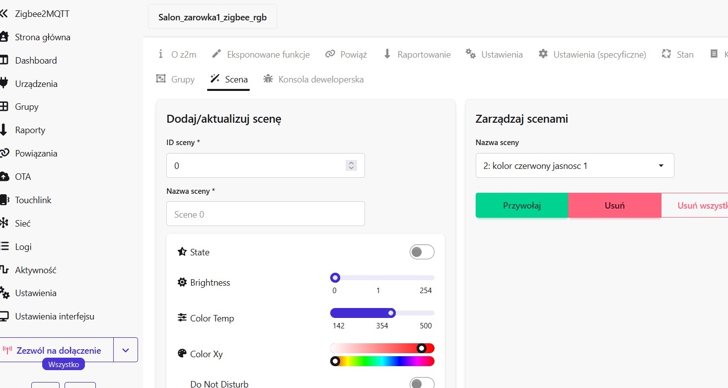Znalazłem w zakladce zigbee2mqtjest > zarowka jest opcja scenn ale pozniej jak ją przeniesc do scen w głonym panelu home asistant( foto4)