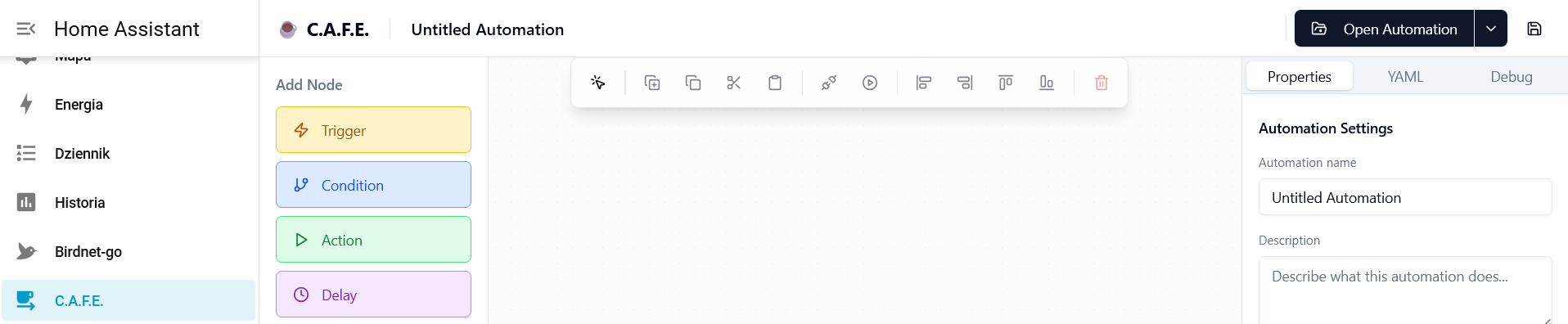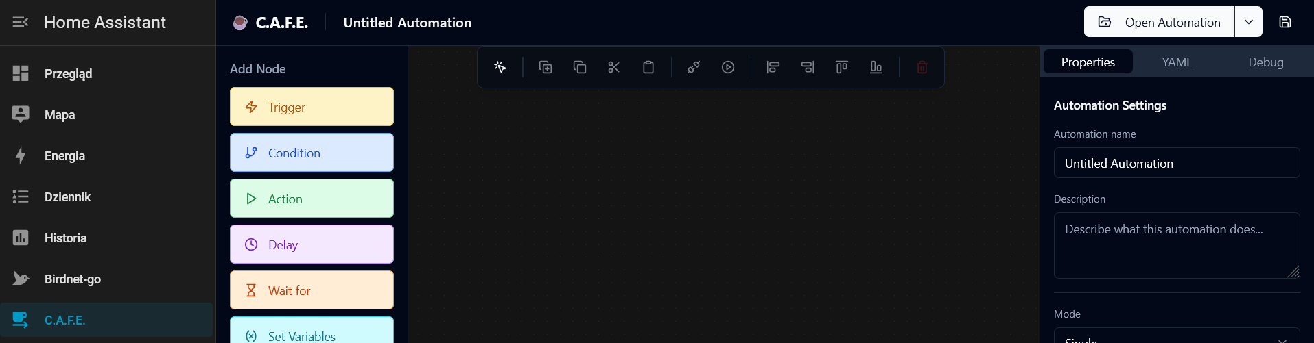 C.A.F.E. to wizualny edytor przepływów, który wprowadza możliwości w stylu Node-RED do Home Assistant bez użycia zewnętrznego silnika. Transpiruje on diagramy wizualne do w 100% zgodnej, natywnej logiki Home Assistant, przechowywanej bezpośrednio w systemie głównym.