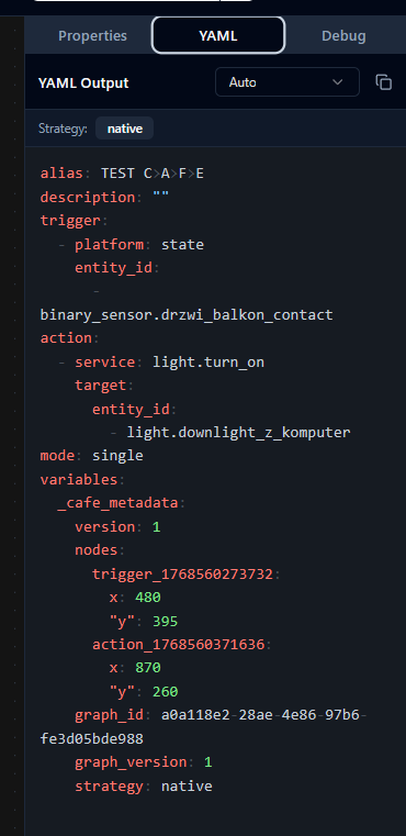 Wszystkie automatyzacje które posiadam wklejone do cafe w trybie *.yaml działają bez problemu, nie są to jakieś skomplikowane automatyzacje. Samo tworzenie automatyzacji też działa bez problemu, natomiast jeżeli w kodzie wklejonej automatyzacji są jakieś pola typu null lub niedostępne encje program generuje błędy typu "Graph must have at least one trigger node"