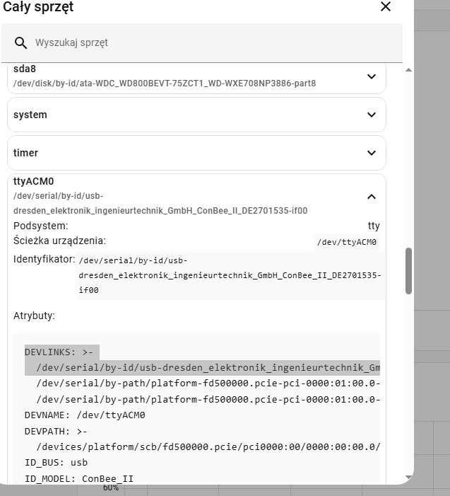 [2026-02-03 21:21:32] debug: zh:adapter:discovery: Connected devices: [{"path":"/dev/ttyACM0","manufacturer":"dresden elektronik ingenieurtechnik GmbH","serialNumber":"DE2701535","pnpId":"usb-dresden_elektronik_ingenieurtechnik_GmbH_ConBee_II_DE2701535-if00","vendorId":"1cf1","productId":"0030"}]