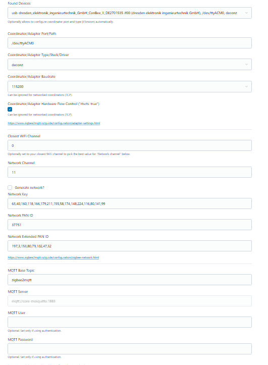 [2026-02-03 21:21:32] debug: z2m: Using zigbee-herdsman with settings: '"{\"network\":{\"panID\":61912,\"extendedPanID\":[16,251,112,218,32,11,180,25],\"channelList\":[25],\"networkKey\":\"HIDDEN\"},\"databasePath\":\"/config/zigbee2mqtt/database.db\",\"databaseBackupPath\":\"/config/zigbee2mqtt/database.db.backup\",\"backupPath\":\"/config/zigbee2mqtt/coordinator_backup.json\",\"serialPort\":{\"baudRate\":115200,\"rtscts\":false,\"path\":\"/dev/ttyACM0\",\"adapter\":\"deconz\"},\"adapter\":{\"disableLED\":false}}"'