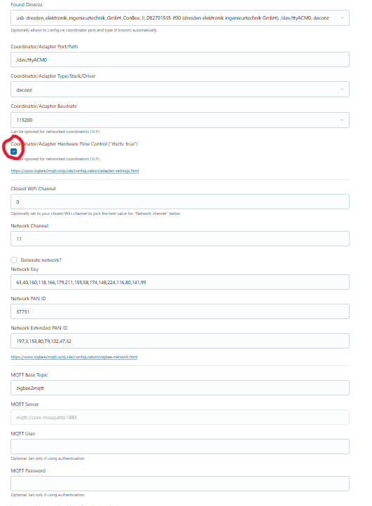 [2026-02-03 21:20:30] debug: z2m: Using zigbee-herdsman with settings: '"{\"network\":{\"panID\":61912,\"extendedPanID\":[16,251,112,218,32,11,180,25],\"channelList\":[25],\"networkKey\":\"HIDDEN\"},\"databasePath\":\"/config/zigbee2mqtt/database.db\",\"databaseBackupPath\":\"/config/zigbee2mqtt/database.db.backup\",\"backupPath\":\"/config/zigbee2mqtt/coordinator_backup.json\",\"serialPort\":{\"baudRate\":115200,\"rtscts\":false,\"path\":\"/dev/ttyACM0\",\"adapter\":\"deconz\"},\"adapter\":{\"disableLED\":false}}"'