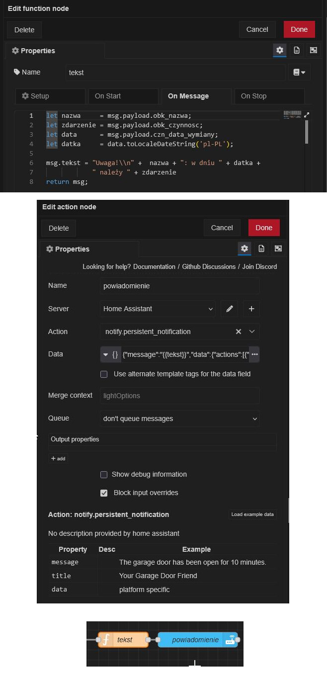 Ale chciałem to przerzucić (w oparciu o te dwie tablice) do HA i w nodeRED wygenerowałem sobie proces (działa tak jak aplikacyjka) który sprawdza i jak termin akcji się zbliża to generuje powiadomienie HA - działa, super.