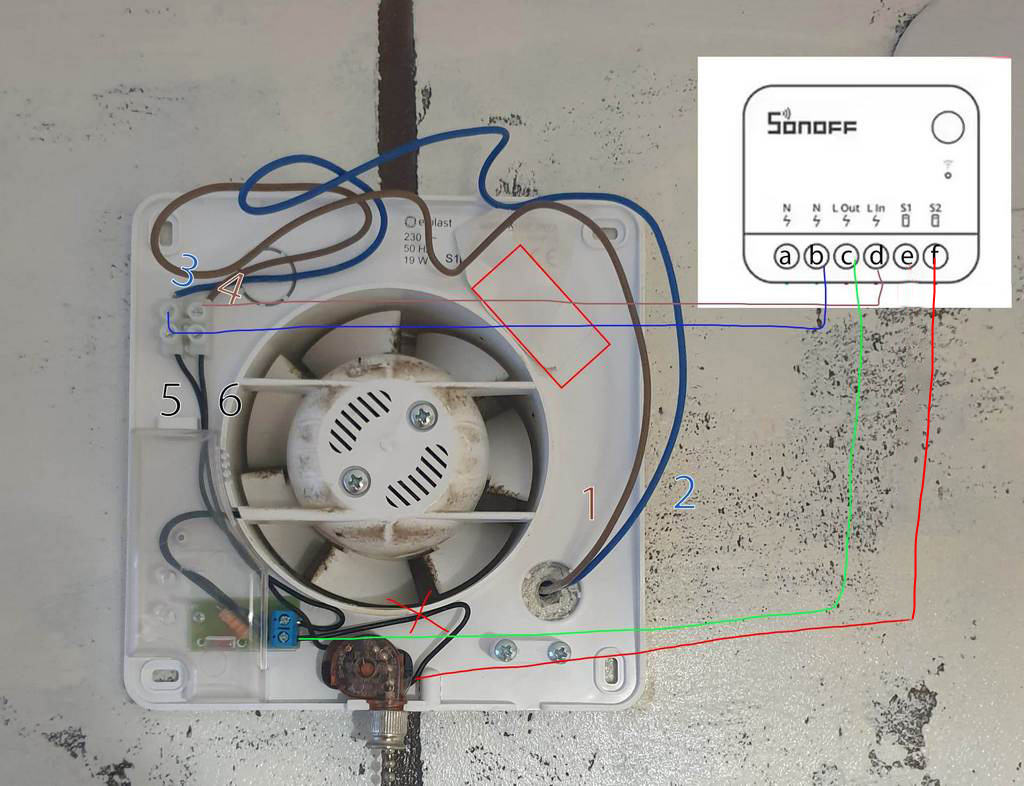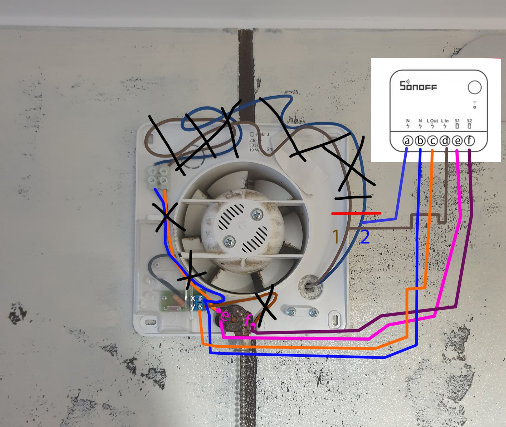 Skoro instrukcja tego Sonoffa (schemat nr 3) dopuszcza sterowanie fazą (L) na styku S2, to robienie tego metodą bezpotencjałową jest szukaniem problemów tam, gdzie ich nie ma. Metoda nr 3 z instrukcji pozwala zachować fabryczną instalację wentylatora.