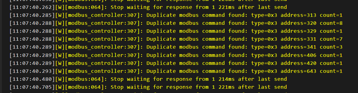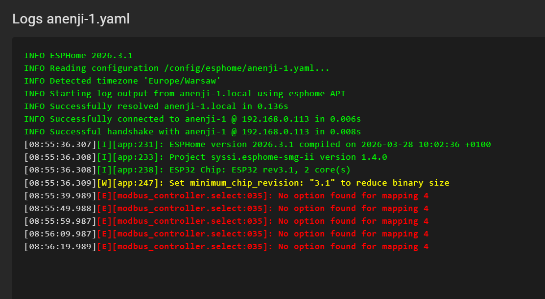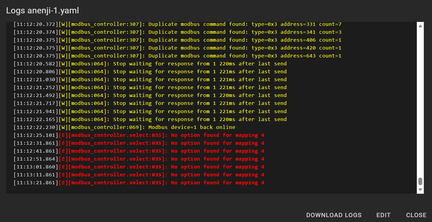 Żółte błędy, to nie są błędy, tylko ostrzeżenia. Jeśli nie chcesz ich oglądać możesz wyciszyć, bo nie ma nic nienormalnego w tym, że nieczynny falownik nie odpowiada (chociaż może lepiej byłoby ogarnąć jakoś obsługę offline? za to nie widzę specjalnego powodu do zmniejszania częstotliwości odpytywania skoro daje radę gdy działa).