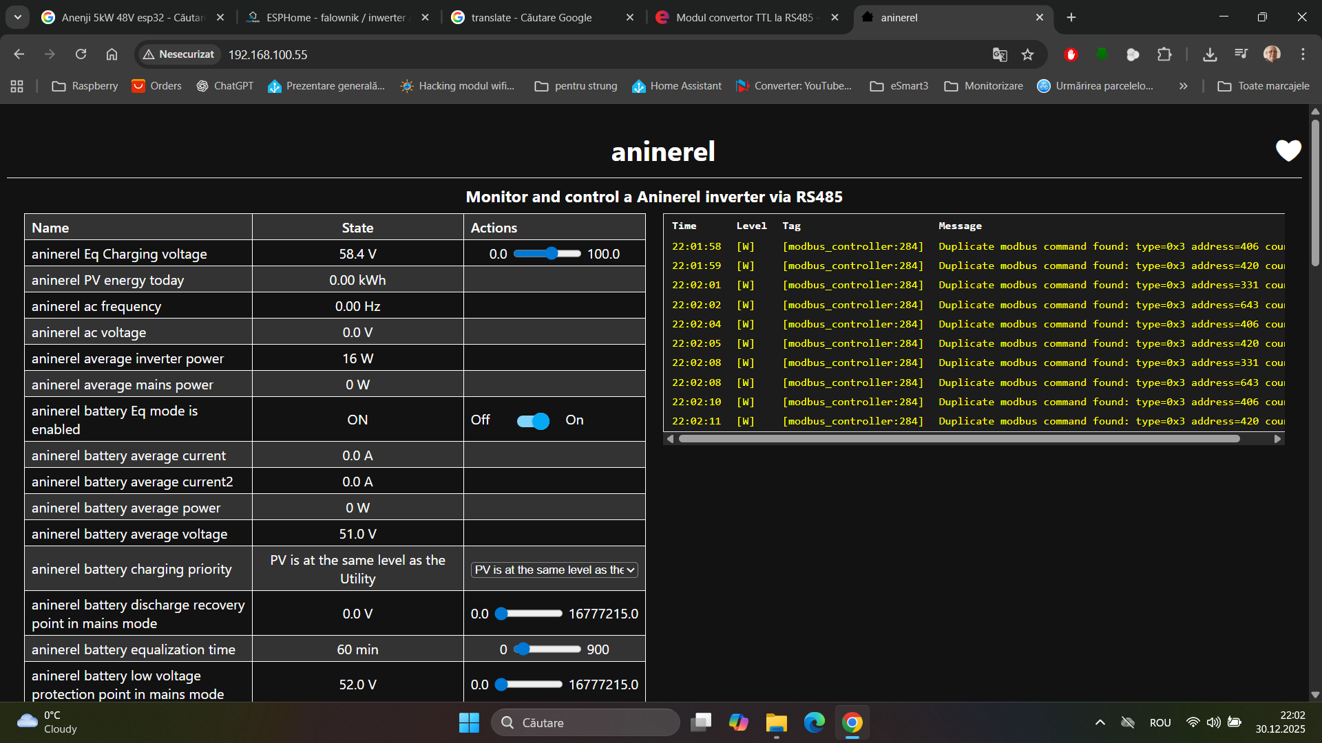 I have this type of inverter with integrated wifi, I want to give up on it and connect it with an esp8266D1 and TTL to RS485 converter module. I managed to get the data, I connected to the RJ45 port, pin 1 and 2, the 3.3v voltage I took directly from the board. The first time it gave an error, there was a conflict, so I cut the power to the chip on the SP485EE board, now the error has disappeared but I still have warnings.I’m thinking of connecting directly to the jack but my converter has inputs A and B