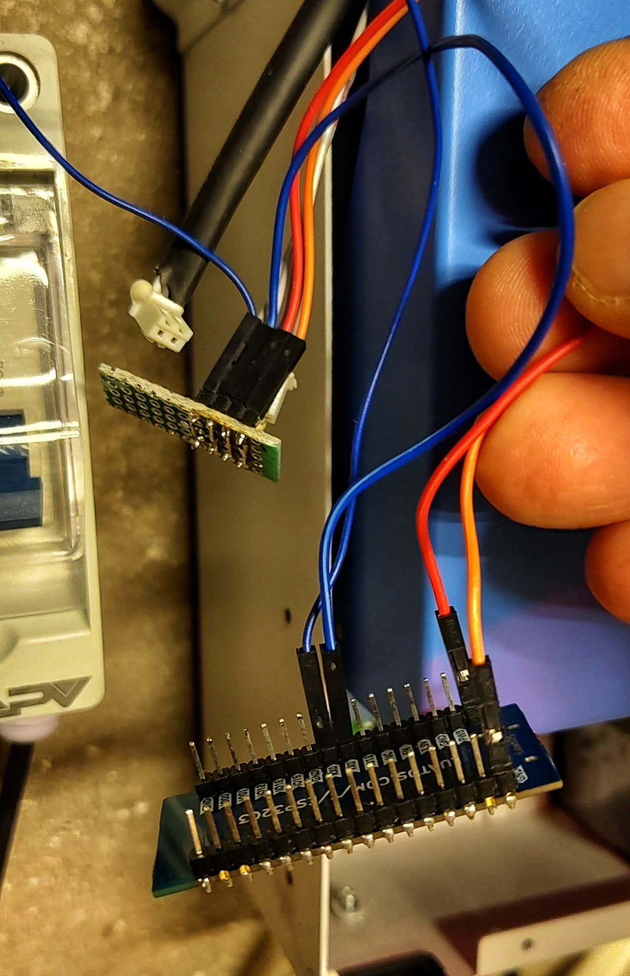 RX, TX, +5V i GND i wygląda że działa. Tak na serio będę się tym bawić pewnie w przyszłym roku jak wróci słońce i panele będą dawać prąd.
