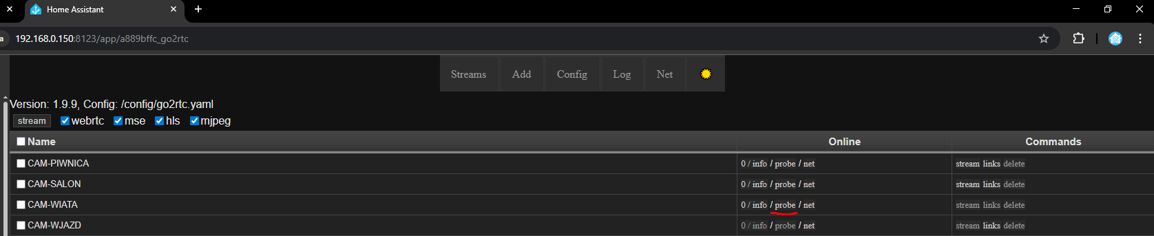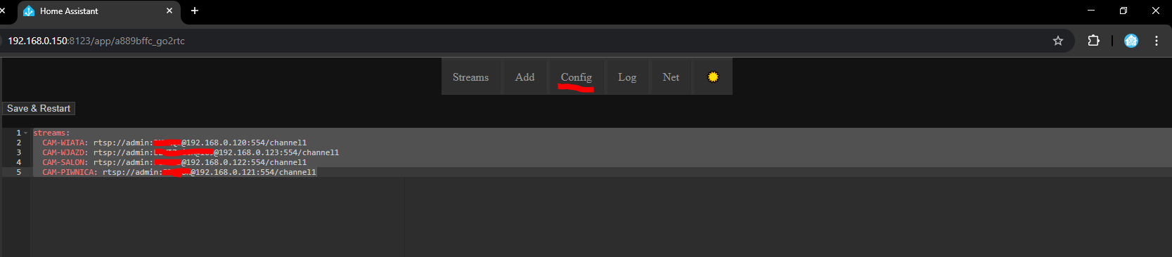 Teraz ważny dodatek go2rtc który jest już wbudowany, wchodzimy na http://homeassistant.local:1984 i w zakładce konfiguracji dodajemy streamy rtps