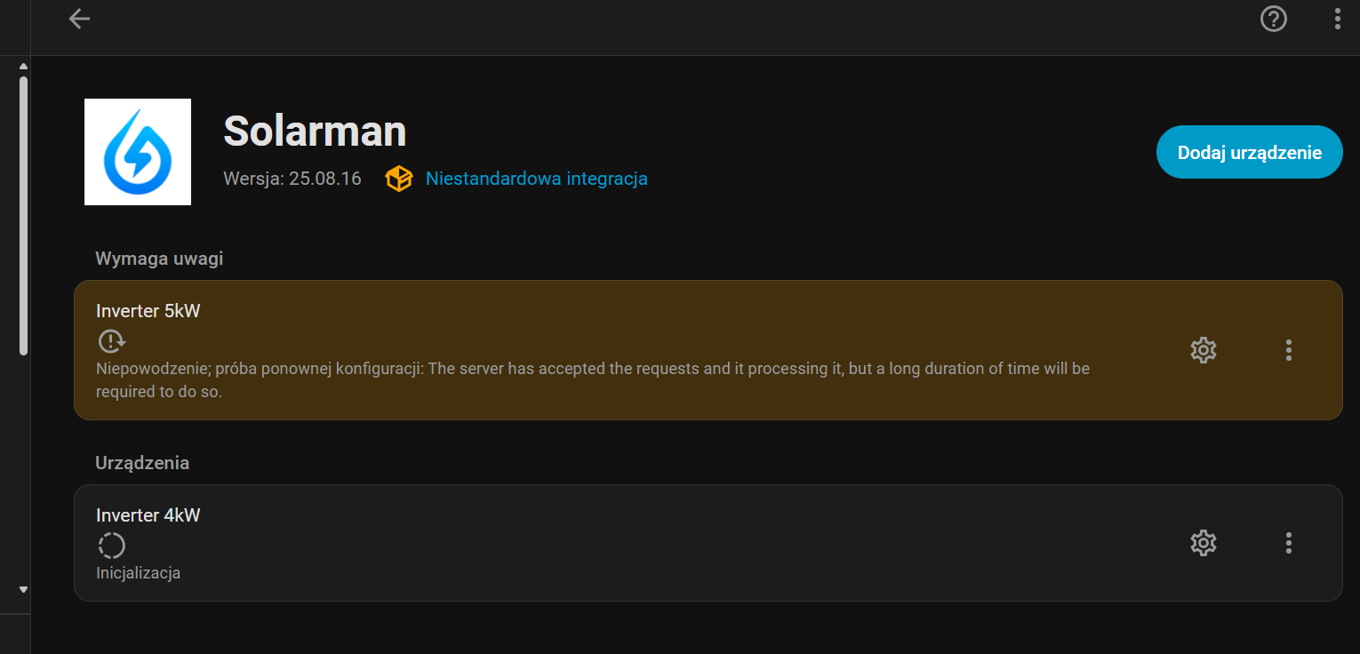 Witam zainstalowałem dodatek SOLARMAN z HACS’a i wszystko pięknie wykrył falowniki jednak nie potrafi odczytać danych z falowników nie umie dokończyć konfiguracji, objawia się to takim komunikatem, co może być powodem i jak sobie z tym poradzić :