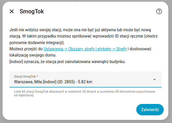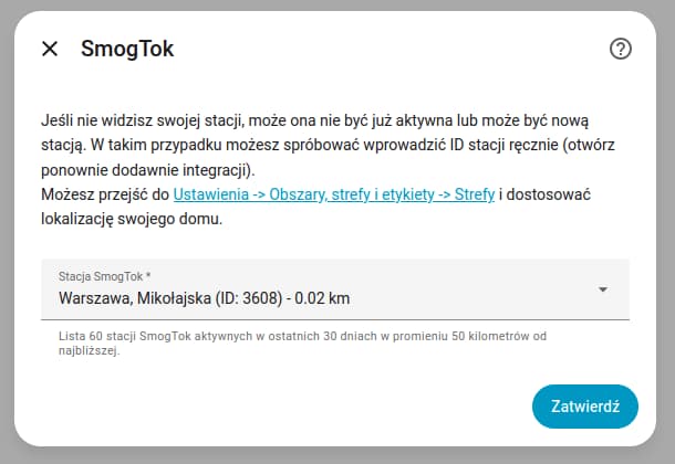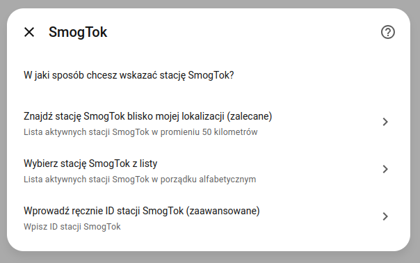 Właśnie wydałem wersję 1.1.0 integracji umożliwiającą znalezienie i dodanie stacji z listy najbliższych stacji względem lokalizacji domu w Home Assistant. Nie jest już konieczne szukanie swojej stacji z listy kilkuset do wyboru