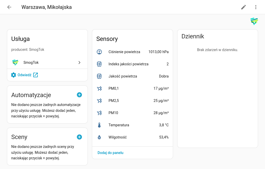 Jeśli ktoś poszukuje, stworzyłem integracje dla stacji jakości powietrza SmogTok konfigurowalną przez interfejs użytkownika. Integracja jest dostępna w HACS po dodaniu niestandardowego repozytorium.