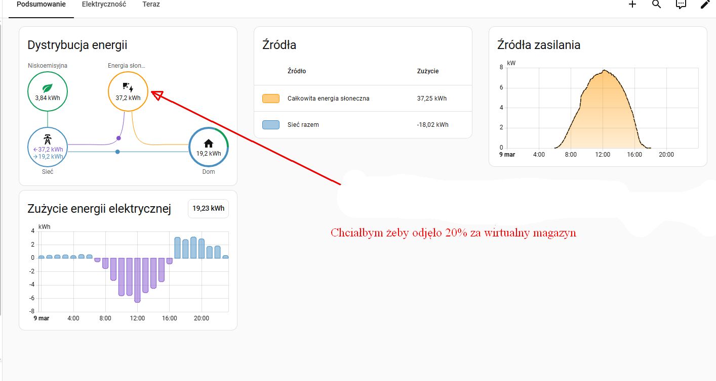 Dodałem pomocnika, nie działa tak jak bym chciał, ja chcę przeskalować dane tauron_importer ( gdy mam tak ustawione jak na zrzucie, wszystko zgadza się z elicznikiem tyle że produkcja z fotowoltaiki oddanej do sieci nie uwzględnia tych 20% które muszę odjąć z wirtualny magazyn)