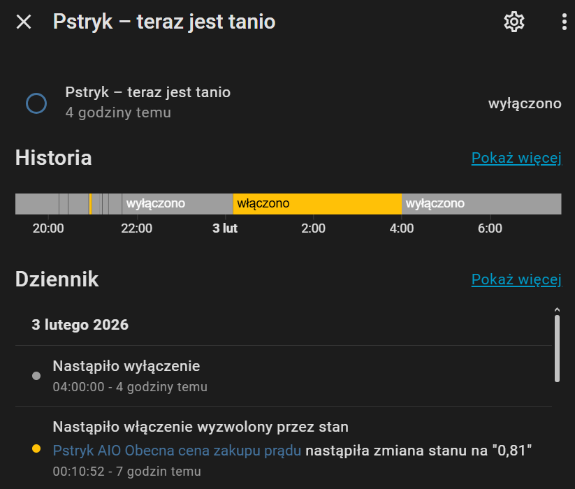 Będzie miał stan “włączony” gdy aktualna cena prądu będzie w przedziale który ustawiłeś jako “tanio”. Możesz sobie wtedy zrobić automatyzację:
