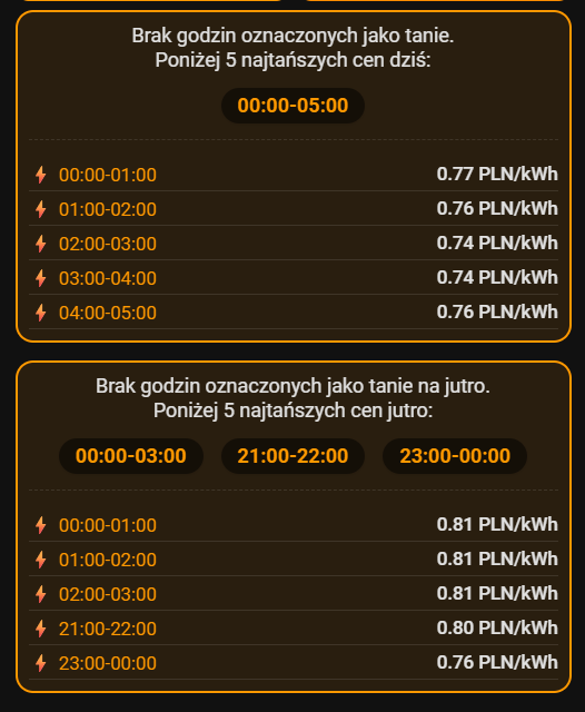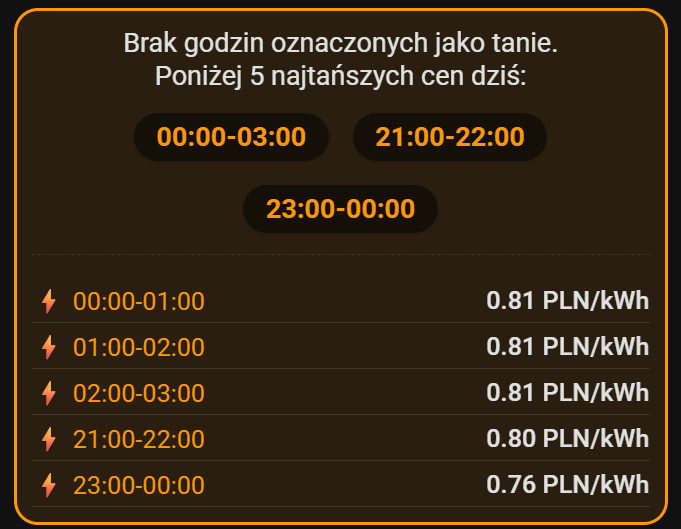 Tutaj można by się pokusić o jakiś inny szablon, który nie bierze wartości “is_cheap” z ustawień integracji, tylko sam sobie oszacuje kiedy jest tanio skoro jest dostępny cennik dla całego dnia, np. 30% najtańszych godzin z dnia, albo kiedy aktualna cena jest niższa niż średnia dla całego dnia…