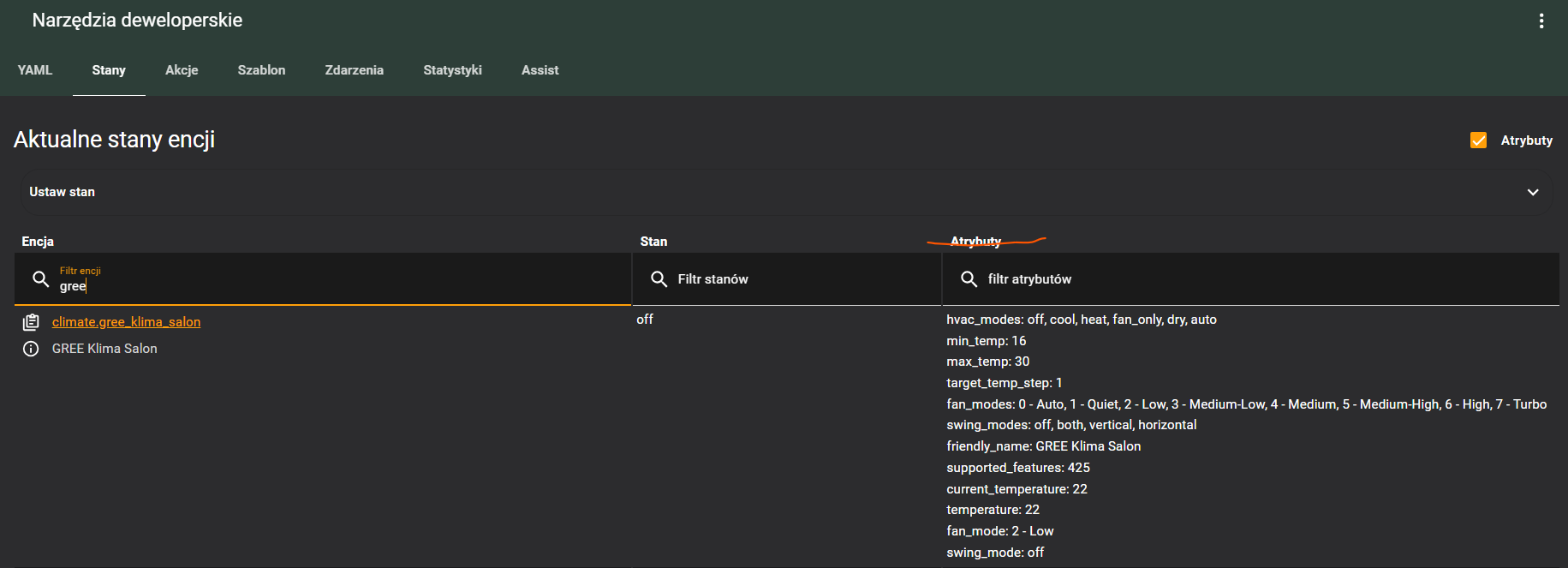 Atrybuty encji możesz sprawdzić w Narzędzia deweloperskie - Stany