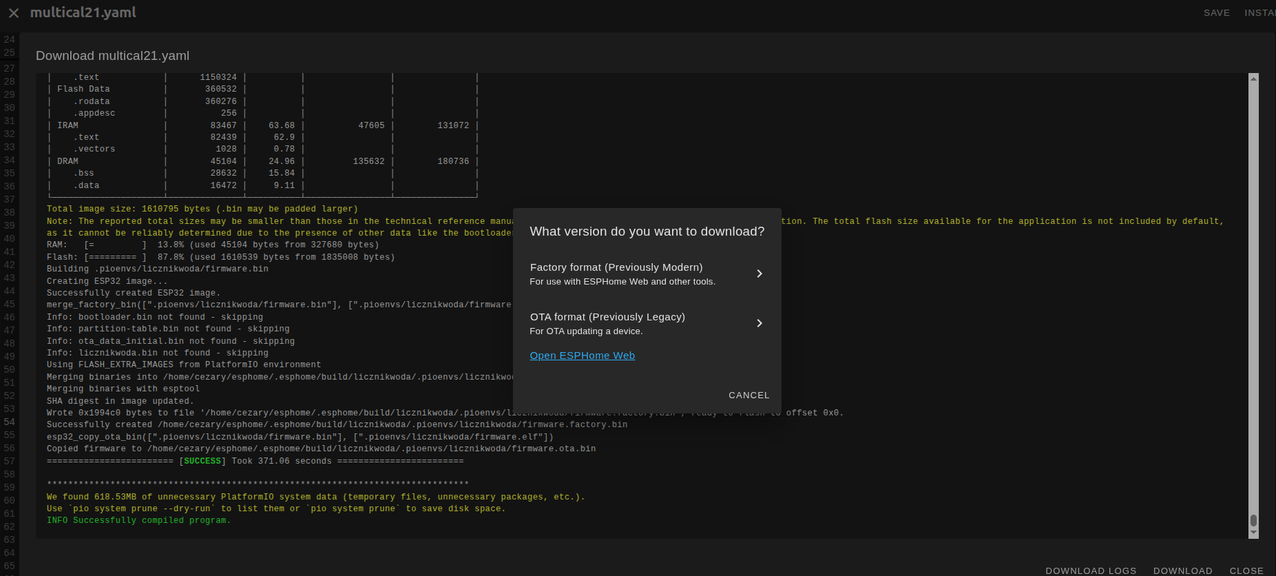 Zrobiłem z ciekawości trzecią próbę, tym razem ESPHome zainstalowany na moim Linux Mint (bazuje na Ubuntu)