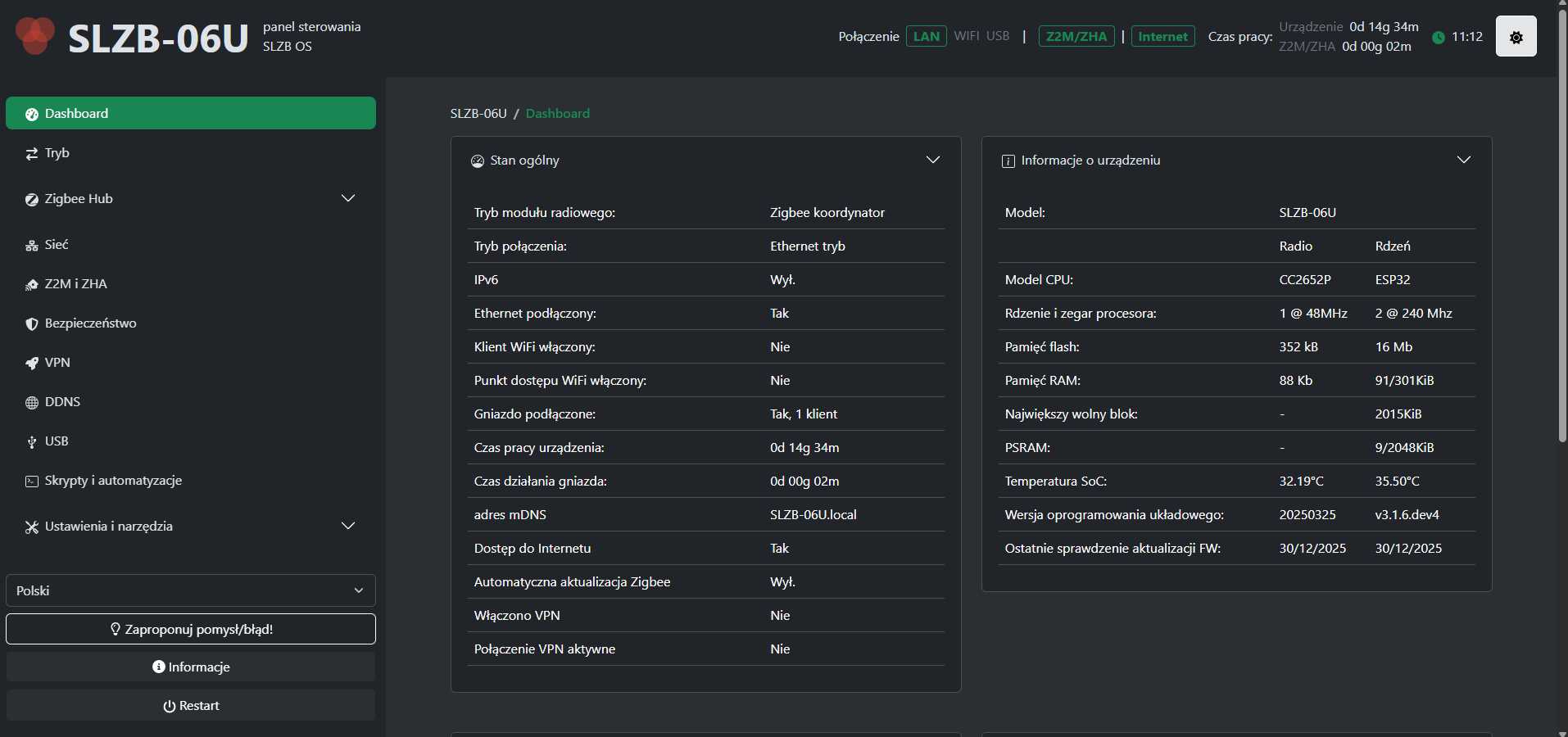 SLZB podłączyłem do LAN + zasilanie USB → konfiguracja: stały adres IP i aktualizacja.
