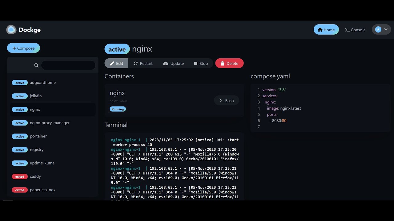 Co bym też gorąco polecał, to zapoznanie się na początek z tworzeniem kontenerów za pomocą Docker Compose i tworzenia pliku (w YAML), który określa całą konfigurację tworzonego kontenera. Tu dla początkujących polecam zaczynać nie od Portainer’a, a od łatwiejszej platformy jaką jest projekt (w formie kontenera oczywiście) Dockge. Zarządzie kontenerami na bazie stacks, które pozwalają na ich odtwarzanie, wersjonowanie i przenoszenie.