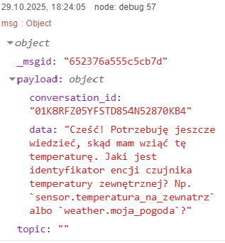“instructions”: “Temperatura zewnętrzna wynosi: {{states(‘sensor.0x00158d000247febb_temperature’) }}°C Napisz w zabawny sposób ile wynosi temperatura. Jedno zdanie.”}