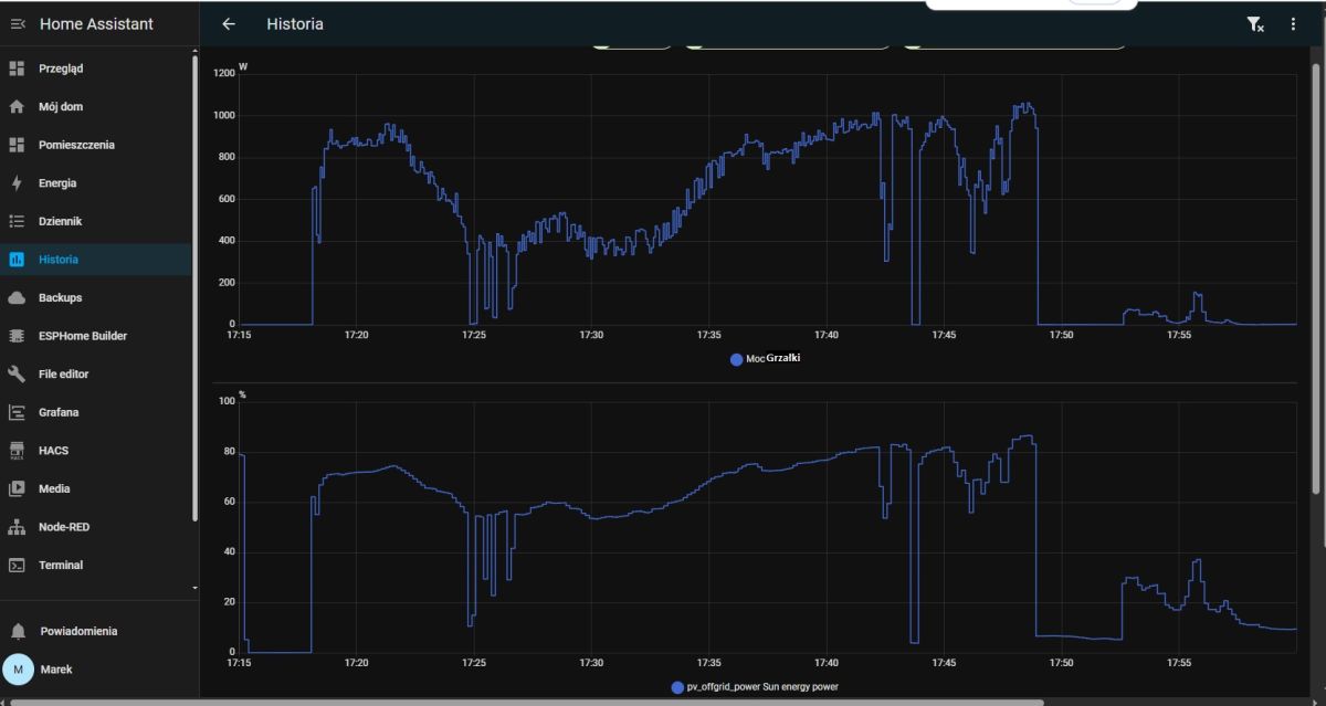 Dostałem od kolegi wykres beta testów dimmera na triaku - jeszcze bez wymiany triaka więc żarówka 100W. Na górnym wykresie encja ± import/export a na dolnym % moc żarówki. Widać że jak pojawił się pobór w domu i z exportu przeszło na import to żarówka zgasła. Sterowanie z ESPHOME, zaczytuje encję import/export z HA, docelowo ma mieć bezpiecznik że jak utraci kontakt z HA to wyłączy odbiornik. Jak widać po idei tych zależności kolega jest w net-bilingu.