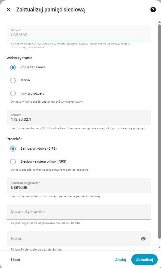 Jeśli chodzi o mnie, to taką konfigurację jak wyżej używam we wbudowanych backupach w HA, ale dzięki temu że jest to udział dedykowany na backupy można go wykorzystać też w Home Assistant Google Drive Backup sugeruję jednak wybrać go w GUI zamiast kombinować co wpisać w konfiguracji (musi być w liście dropdown, jeśli go nie ma to i wpisywanie z palca nie zadziała)