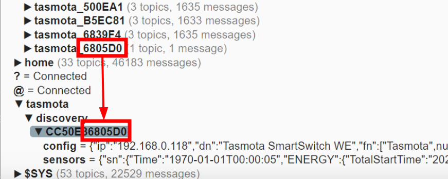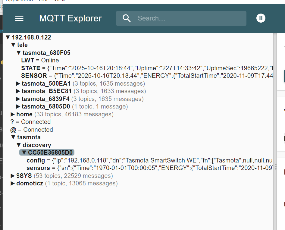 to jest te 5 tasmot czytane przez MQTT Explorera jako TELE