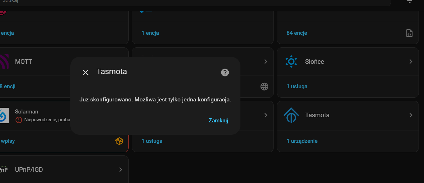 mam 5 urządzeń z wgraną TASMOTĄ i HA ich nie widzi a raczej widzi tylko jedno urządzenie. Z tego co pamiętam jak instalowałem HA poprzednio to akurat wszystkie sonofy z tasmotą (tak, są to sonofy z wgranym softem tasmota) HA wykrył sam nie trzeba było nic robić, teraz instalowałem na nowo HA i już tak nie zadziałało. Co może być powodem ?