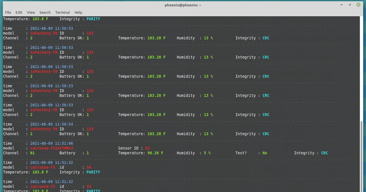 Dla dioagnostyki można uruchomić webserver i korzystać z UI, wystarczy przy komendzie uruchomienia rtl_433 dodać -F http. WebUI będzie pod adresem hosta na porcie 8433