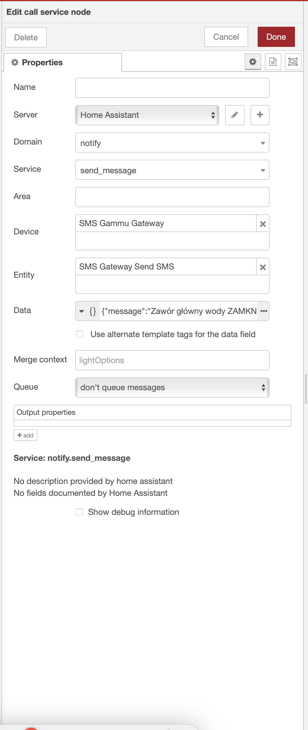 Używam modemu GSM do wysyłania wiadomości SMS z HA na telefon, do tego celu zaprzęgnięty jest Node-Red.