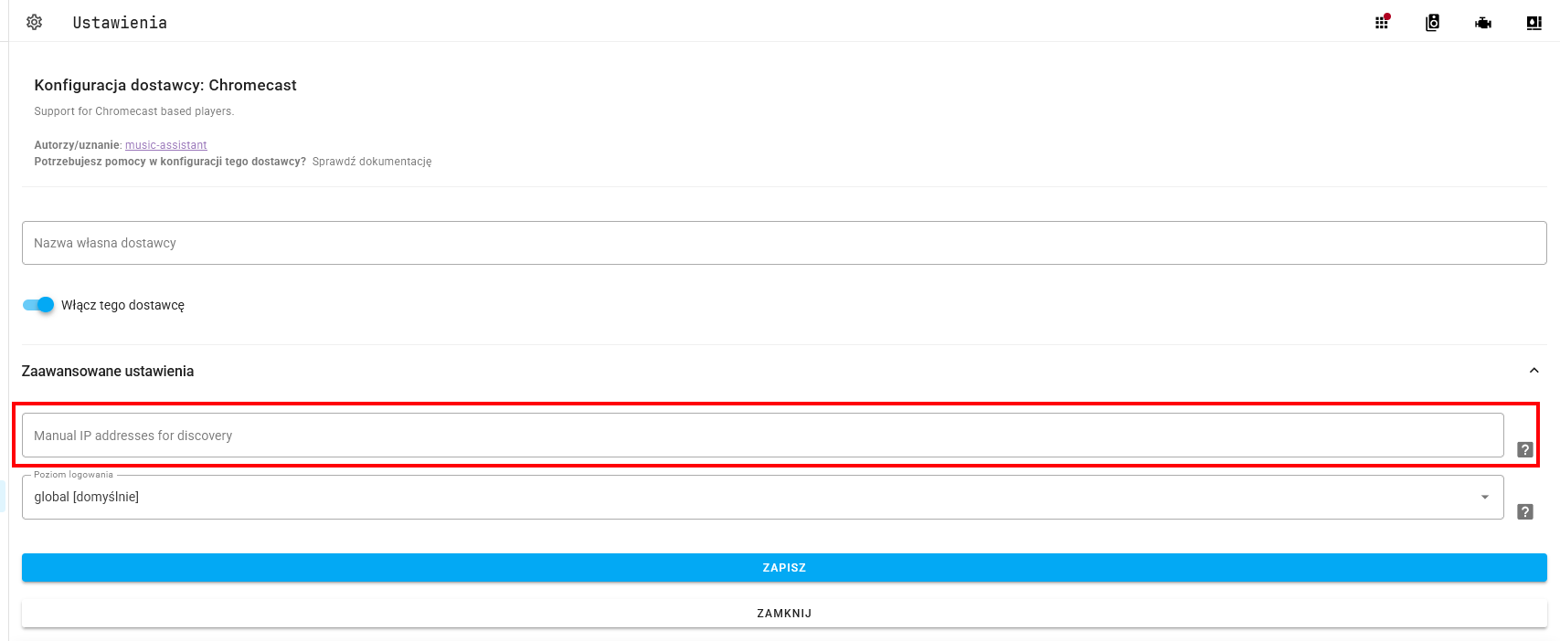 Jeśli MA nie znajduje soundbara jako chromecast, to tym razem możesz jawnie podać IP soundbara w LAN.
