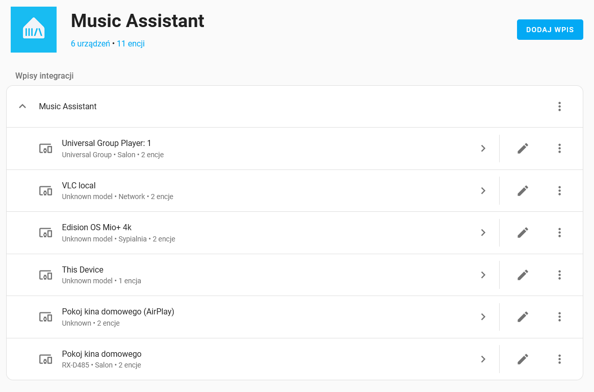 To tak odnośnie MA - skoro jednak masz jakiś media-player, to w MA dodaj sobie również HA jako dostawcę odtwarzaczy i spróbuj coś wysłać w MA na ten odtwarzacz (nie mam na myśli TTS, tylko zwyczajnie jakąś muzę z dowolnego źródła choćby online - jak sobie dodasz jakichś dostawców mediów w MA).