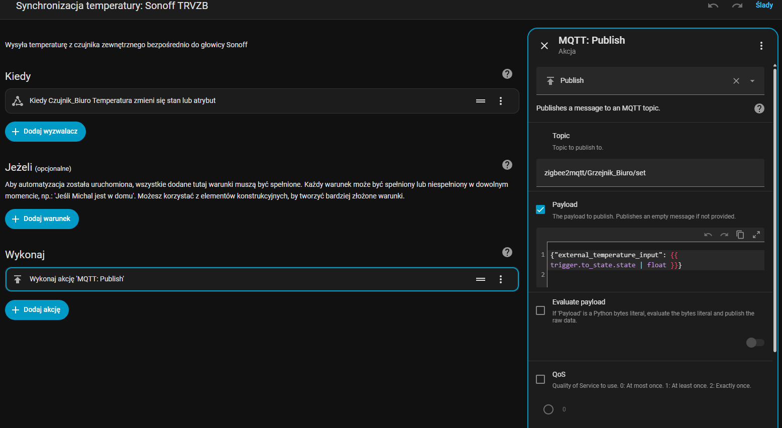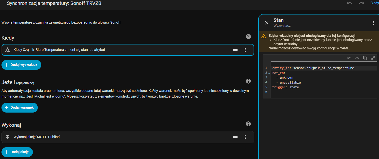 Automatyzację ustawiłeś wzorowo temat (topic) i payload na Twoich screenach wyglądają poprawnie. Jednak masz rację w swoich przypuszczeniach – musisz teraz „powiedzieć” głowicy, żeby przestała słuchać swojego wewnętrznego czujnika.