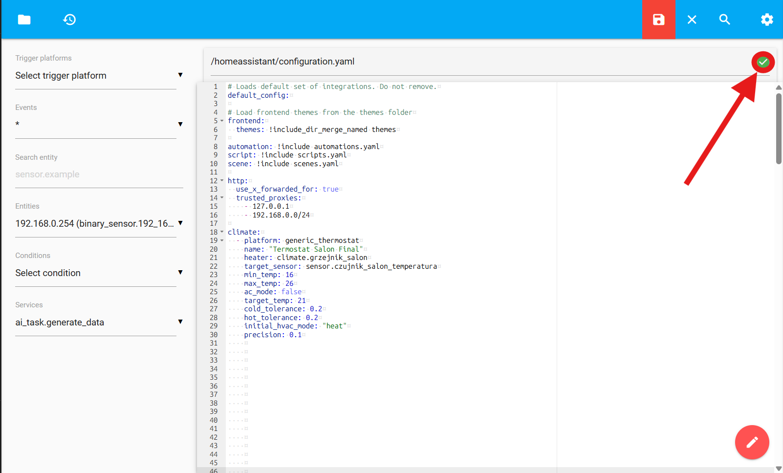 Faktycznie jakas spacja sie wdarla czy cos. Zrobilem cala reszte jak napisales i termostat wlaczyl sie od razu po zapisaniu automatyzacji w biurze. Czy ta automatyzacja steruje wszystkimi termostatami na raz? I pytanie dwa czy on bierze biezaca temperature z czujnika z salony jak w pliku configuration.yaml