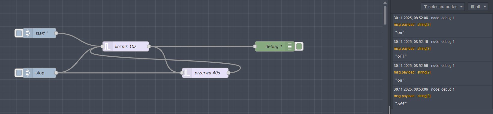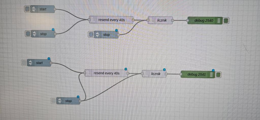 dziękuję , za wyjaśnienia . Na nowo muszę przemyśleć ułożenie węzłów , choć nie ukrywam , że mam zagwozdkę . uruchomić chciałbym ten proces za pomocą button switch - oczywiście najlepiej było by uruchomić interwał w injection i potem trigger lub jakiś licznik countdown , ale injection tylko z poziomu flow da się uruchomić a nie z panelu .wcześniej zrobiłem coś takiego , ale tak jak opisywałeś za dużo msg przelatywało przez węzły i gdzieś po jakimś czasie może się wywalić . podrzucam link dla innych jako pomysł choć nie do naśladowania gdyż pomimo że działa to jest kiepskim rozwiązaniem . opiszę tylko co to robi . uruchamiamy agregat tak jak stacyjka samochodu “włącz” potem uruchamiamy sekwencję kręcenia rozrusznikiem 10sek z przerwami co 40sek . jeśli silnik się uruchomi to dostaje sygnał z wejścia GPIO i rozrusznik przestaje kręcić - agregat pracuje . jednak kiedy agregat przestanie pracować (silnik gaśnie) , wtedy program dostaje info też z wejścia GPIO i wszystko się wyłacza i czeka na naszą reakcję . możemy też sami wyłączyć agregat wyłaczając go switchem wyłącz tak jak byśmy przekręcili stacyjkę samochodu na OFF .