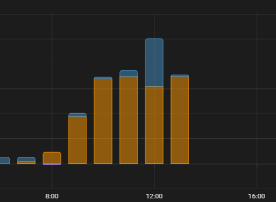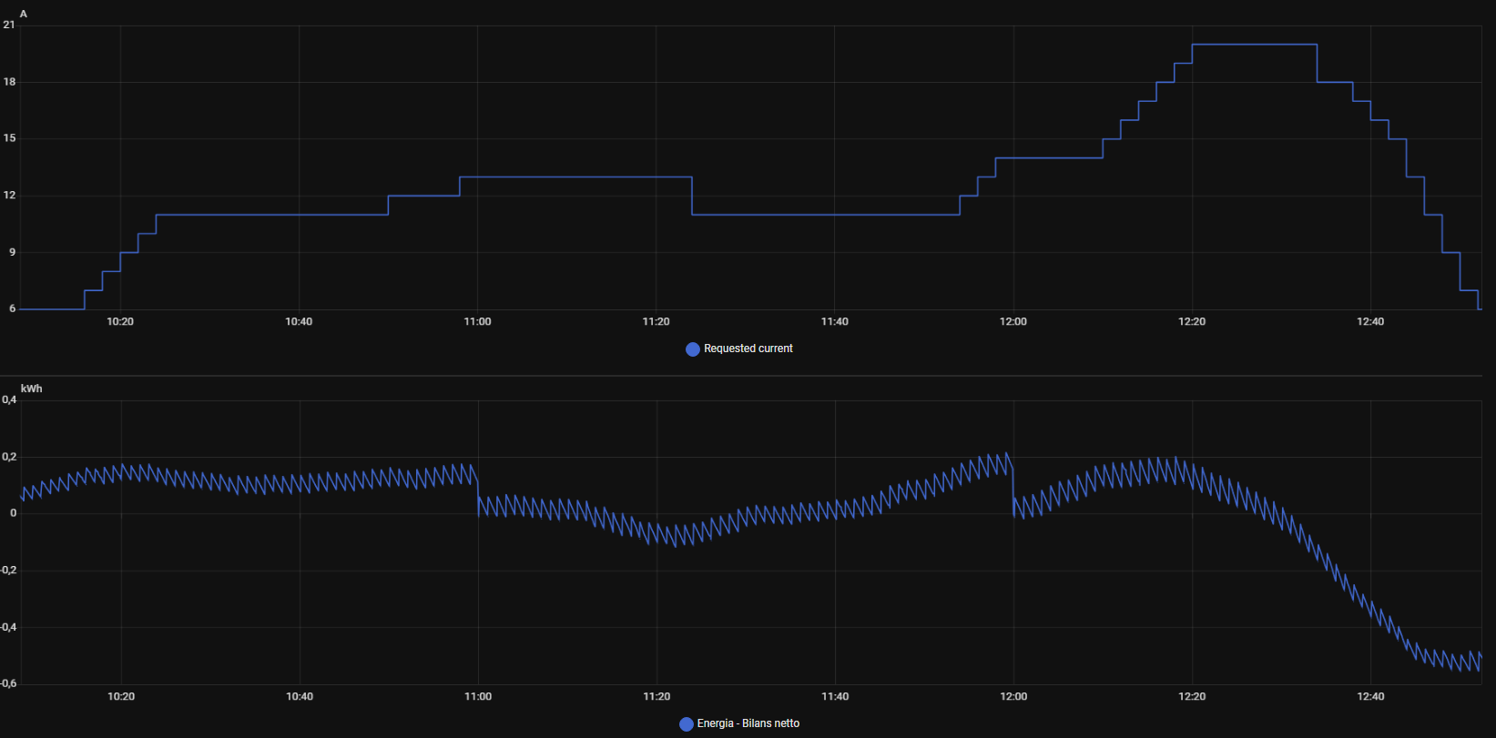 Tutaj widać jak reguluje gdy bilans w danej godzinie pozwala zwiększać prąd ładowania (bilans idzie w kiedunku eksportu) lub gdy bilans przechodzi na import i prąd ładowania zostaje zredukowany.
