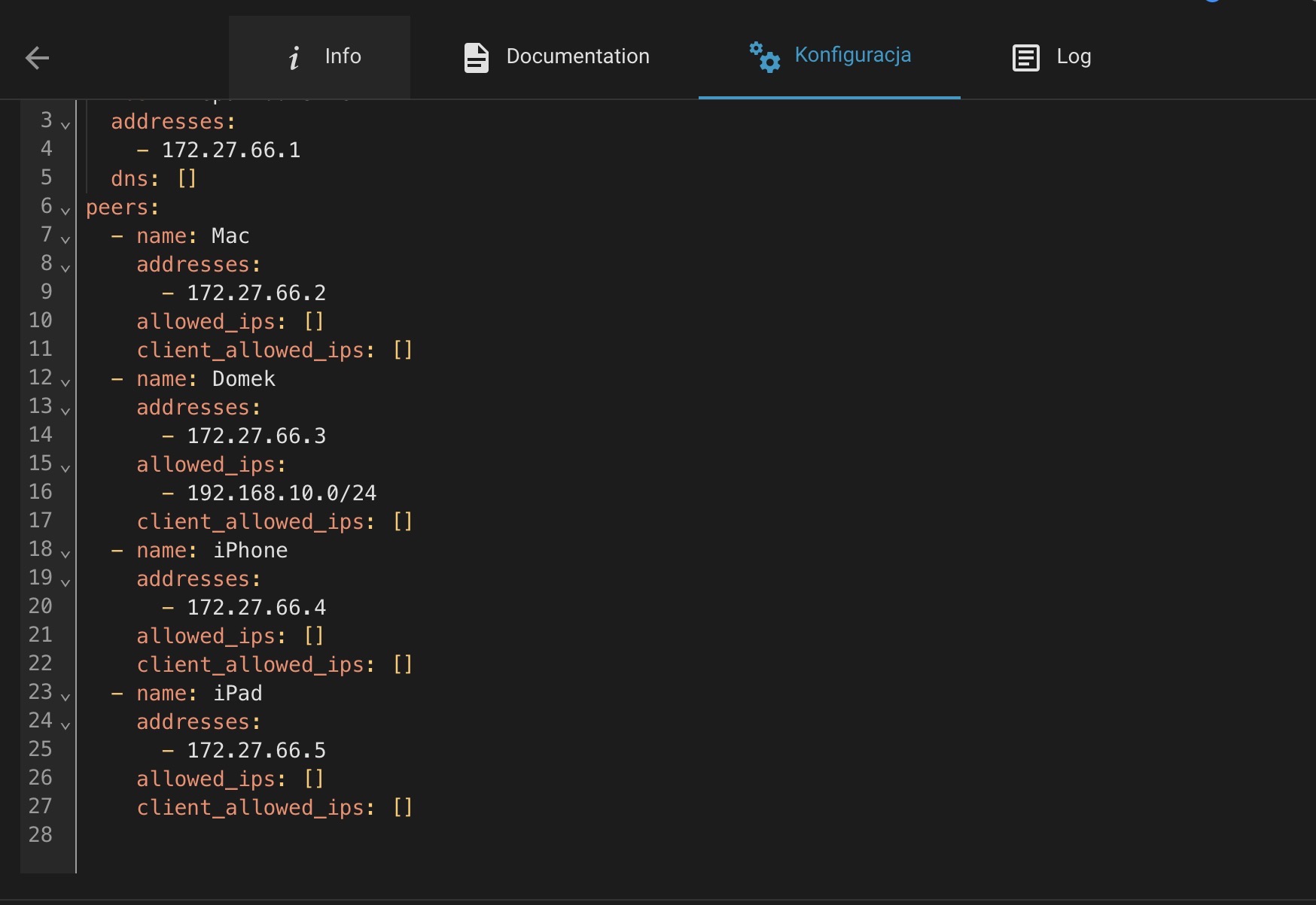 Dziękuję za ten obszerny opis mojego problemu. Wskazówka z dodaniem w Allowed_IPs bardzo mi pomogła. Zauważyłem dziwny problem HA i dodatku Wireguard. Jak konfigurowałem nowego Peera w formie wizualnej nie mogłem go zapisać bez dodania 0.0.0.0/0 w Allowed_IPs. Po dodaniu tej opcji cały VPN przestawał działać. Ale jeśli dodałem nowego Peera w pliku yaml, wszystko działa. Żeby było jasne mam dodany teraz tylko wewnętrzny adres vpn we wszystkich peerach oczywiście każdy inny. Bez wypełnienia Allowed_IPs i Allowed_clients. Wszędzie sie teraz łącze do routera działki i HA w domu
