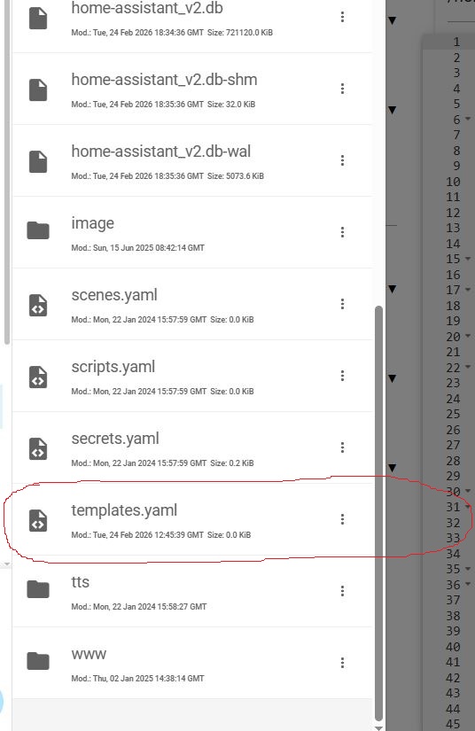 Mogę Ci dać jakiś yaml. Ale, jak narazie widzę, że masz dwa razy wpis template: !include templates.yaml oraz pomieszane sekcje (np. frontend: wewnątrz default_onfig:). Wyczyść to, aby każda kluczowa fraza (template, automation, script) występowała tylko raz.