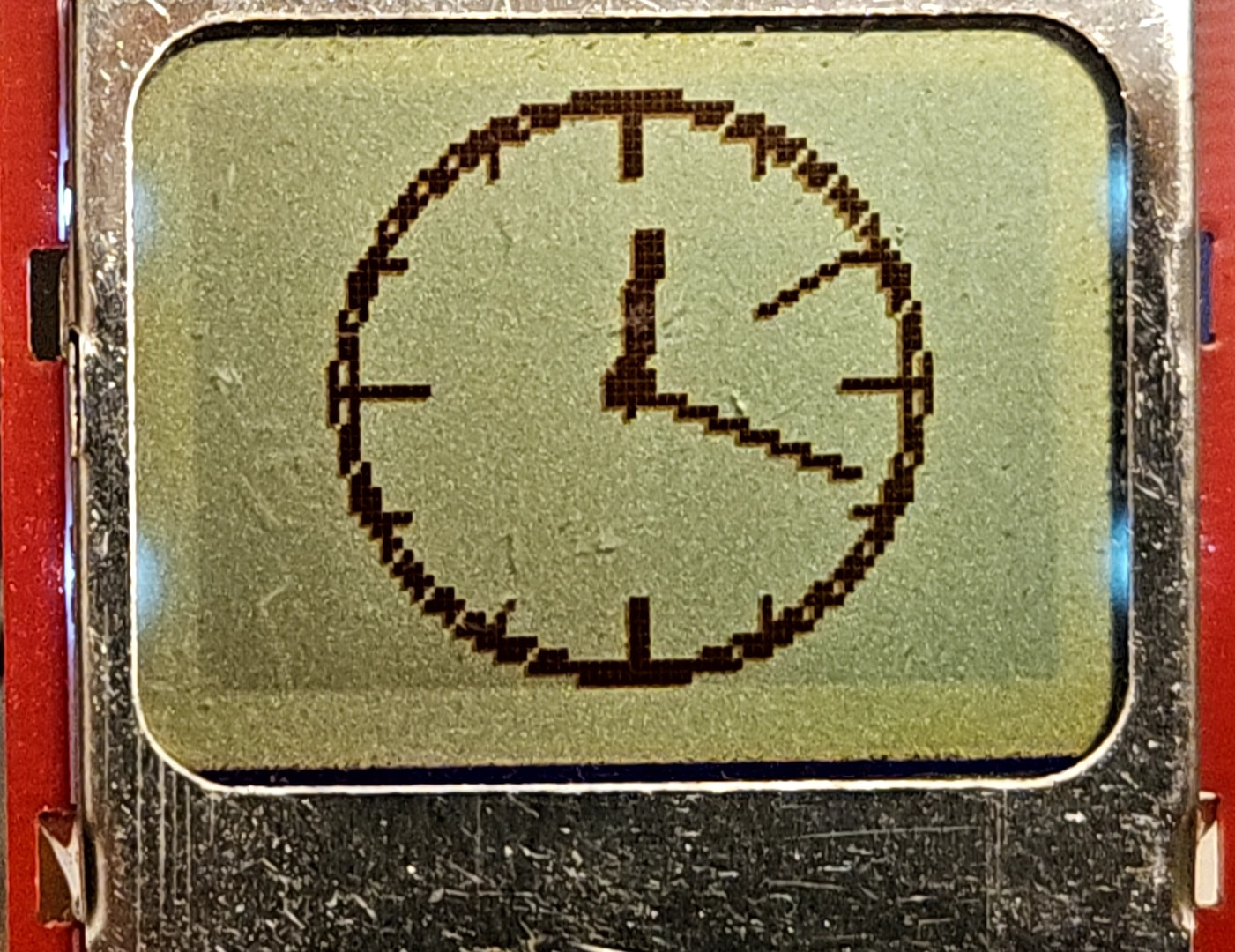 Tak w ogóle zacząłem to skrobać, bo kiedyś obiecałem kilka słów o testowaniu wyświetlaczy i obiecałem posta, a biorąc pod uwagę stan tego odrapańca oczywiście pierwsze co zrobiłem to kilka testów (no i… jest sprawny i na pierwszy rzut oka wygląda w miarę OK, ale zdjęcia okrutnie eksponują każdą wadę…), a generalnie to ten wyświetlacz nie jest najprzyjaźniejszy w skonfigurowaniu, ale da się z niego wycisnąć ostatnie soki ;D u mnie ma służyć do samoróbki czujników jakości powietrza, ale kusiło mnie by nie był totalnie nudny i dorobiłem też zegarek analogowy do wyświetlania (co w sumie nie było szczególnie łatwe, bo zachciało mi się wyświetlania okrągłej tarczy, ale o tym później)