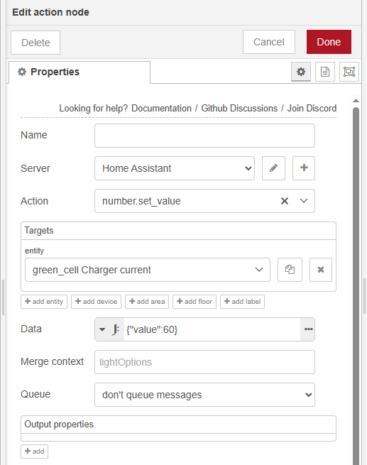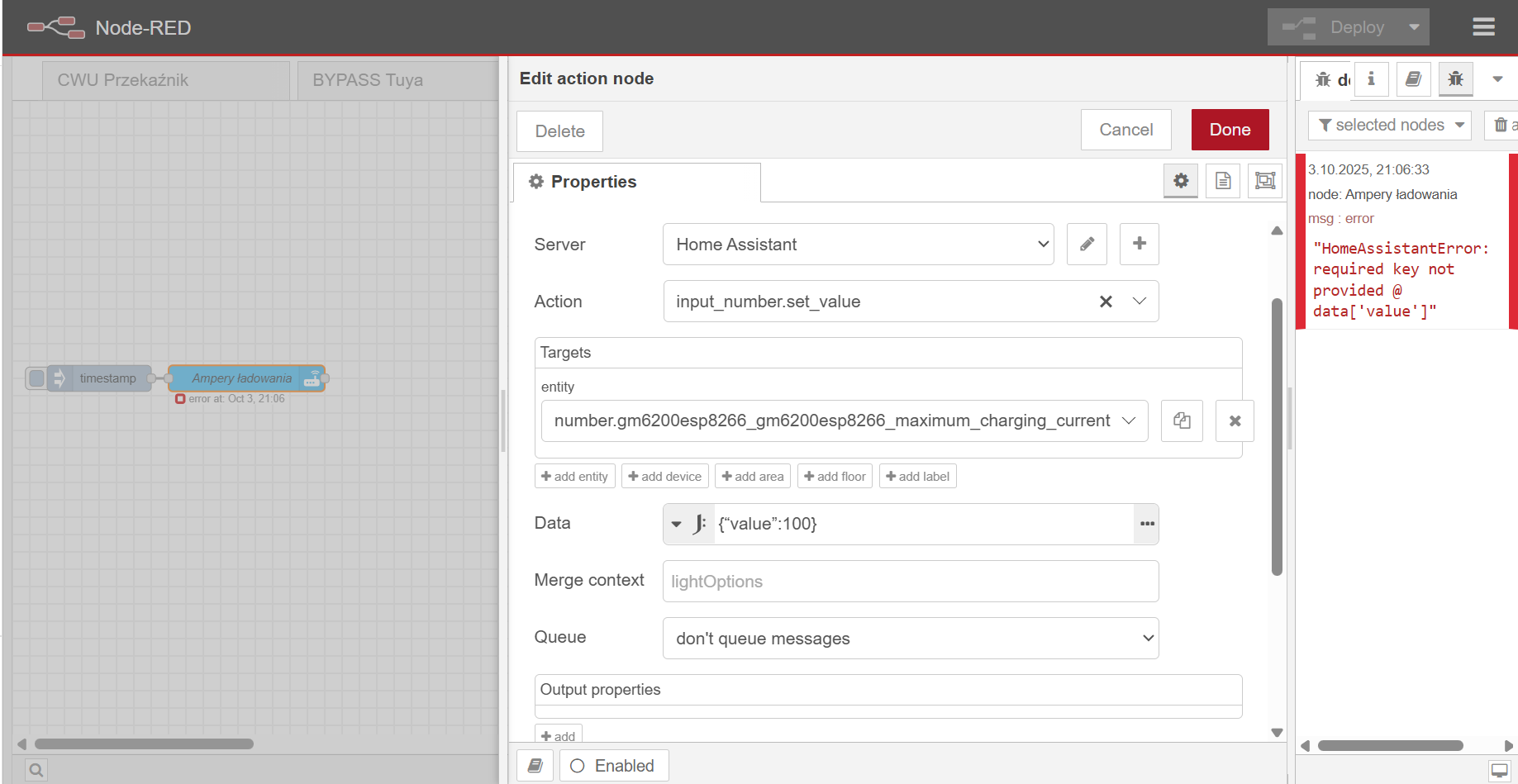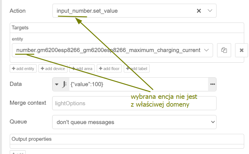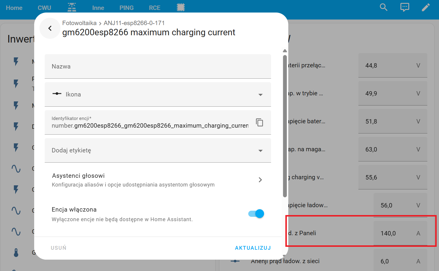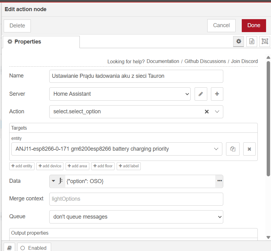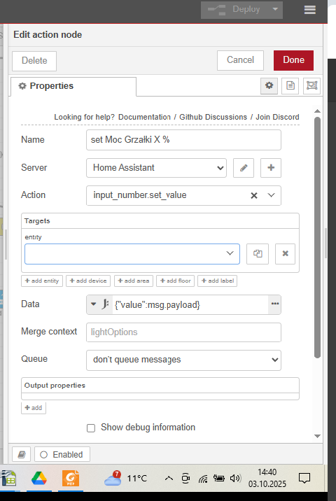 Mogę ten problem bardzo łatwo rozwiązać zmieniając w HA ustawienia prądu ładowania falownika, ale wiadomo , że chce aby jak najszybciej naładował te magazyny dlatego chce zrobić tak aby prąd ładowania był ustawiony na 180A a jeśli jeden z magazynów osiągnie już np .98% naładowania to NR zmieni ustawienia ładowania na 140A. (HA monitoruje parametry obu magazynów) Jedyny problem to taki, że nie wiem jakiego nodu użyć do zmiany nastawienia tego prądu i jak ustawić tego noda. Z ręki mogę swobodnie zmieniać te ustawienia w HA i to działa. Ktoś podpowie jakiego nodu mam użyć aby NR zmieniał mi ustawienia tego prądu, bo męczę się z tym i nic (oczywiście całe reguły sobie ogarnę. Potrzebuje tylko przepis którego noda użyć aby zmienić te ustawienia, bo takich funkcji jeszcze nigdy nie przerabiałem).